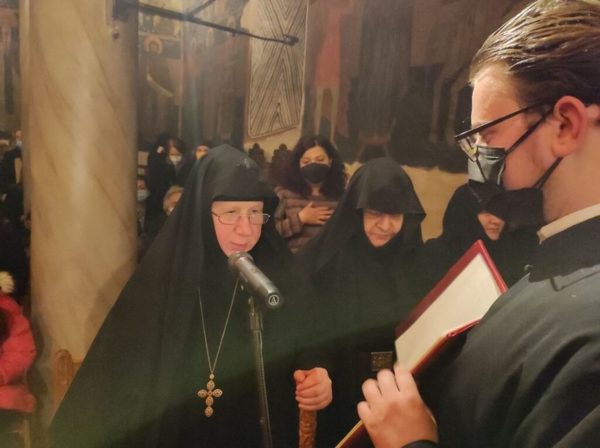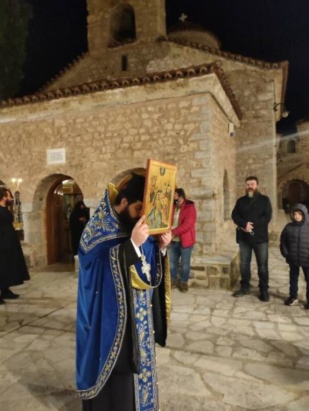 Ακολούθως εν πομπή, ο Σεβασμιώτατος κ. Συμεών, οι κληρικοί, η Ιερά Αδελφότητα, οι Άρχοντες και ο πιστός λαός, μετέβησαν στο Αρχονταρίκι της Μονής, όπου ο κ. Συμεών ευλόγησε την Βασιλόπιτα της 15μελούς Γυναικείας Ιεράς Αδελφότητος και ευχήθηκε πατρικά καλή και ευλογημένη χρονιά, προτρέποντας τον Διευθυντή του Ωδείου της Μητροπόλεως «ΓΕΡΜΑΝΟΣ ο ΜΕΛΩΔΟΣ» να ψάλει μαζί με τους Ιεροψάλτες το πολυχρόνιο της Γερόντισσας.