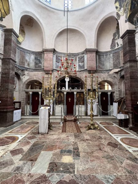Αρχικά προσκύνησαν στον Ναό του Αγίου Ισιδώρου στη Λέτσαινα, όπου εκεί βρίσκεται ο τάφος του Αγίου καθώς και της Αγίας Μυρώπης. Έπειτα προσκύνησαν στην Ιερά Μονή Παναγίας Βοήθειας, εκεί όπου έζησε ο Άγιος Άνθιμος της Χίου. Στην Ιερά Μονή της Παναγίας Βοήθειας προσκύνησαν τα αγία και ιαματικά λείψανα του Αγίου Ανθίμου, ο οποίος όσο ήταν εν ζωή σταύρωνε άτεκνα ζευγάρια και αποκτούσαν παιδιά. Κάτι το οποίο συμβαίνει και μετά το θάνατο του, όσοι με πίστη προσκυνούν τα αγία λείψανα του, τα οποία θεραπεύουν τους αρρώστους από πάσα ασθένεια.
