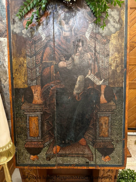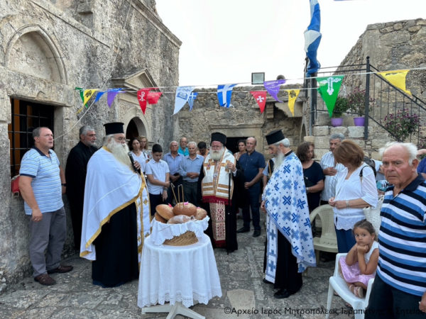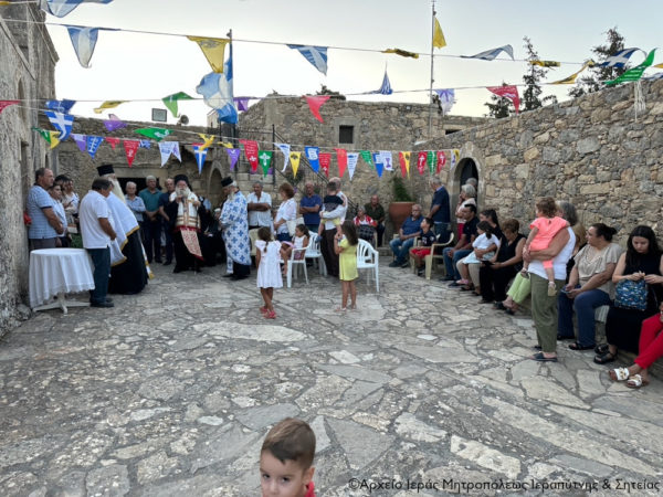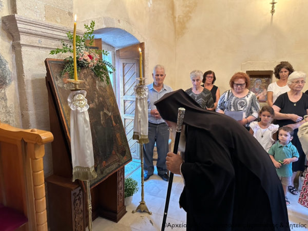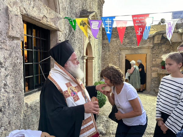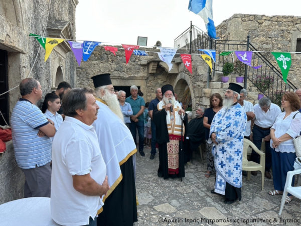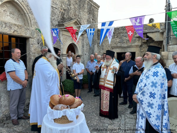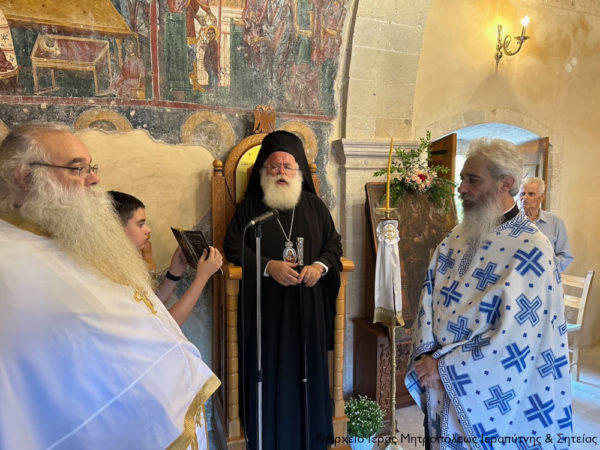 Στην ακολουθία χοροστάτησε ο Σεβασμιώτατος Μητροπολίτης Ιεραπύτνης και Σητείας κ. Κύριλλος, ο οποίος ευλόγησε τους άρτους στο προαύλιο της πάλαι ποτέ διαλαμψάσης Μονής και μίλησε για το πανάχραντο πρόσωπο της Παναγίας μας.
