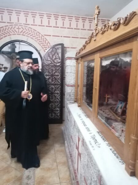 Στην συνέχεια ο π. Γερμανός ξενάγησε τον Σεβασμιώτατο στο Κειμηλιαρχείο της Μονής και στον τάφο του Οσίου Γέροντος Βησσαρίωνος.