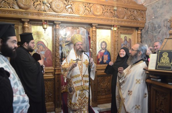 Πριν την απόλυση της Θείας Λειτουργίας η Γερόντισσα Μαρία καλωσόρισε τον Μητροπολίτη με θερμούς λόγους, του ευχήθηκε υγεία και δύναμη στα αρχιερατικά του καθήκοντα και του προσέφερε μια εικόνα του προστάτου της Μονής, αγίου Νικολάου.