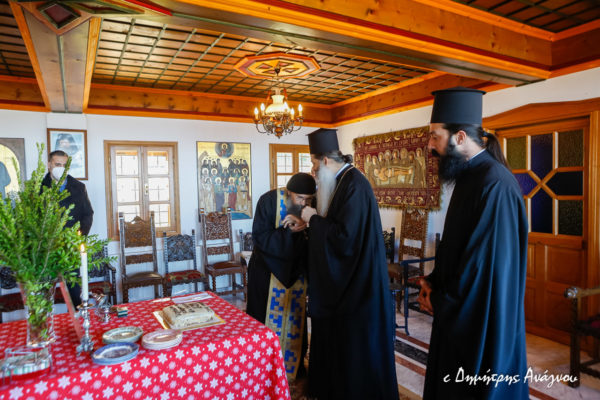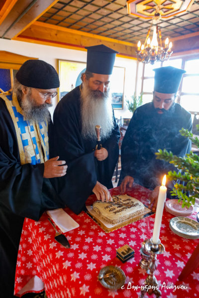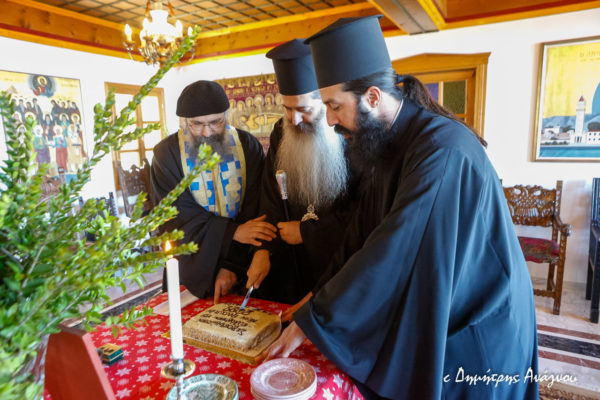 Ο Σεβασμιώτατος κ. Συμεών στο Αρχονταρίκι της Μονής ευλόγησε την Βασιλόπιτα και ευχήθηκε στον Άγιο Καθηγούμενο π. Εφραίμ, η νέα χρονιά να του φέρει δύναμη και υγεία για να συνεχίσει το θεάρεστο έργο, το οποίο επιτελεί στην Μονή και με ζωντάνια και ακμαιότητα να συνεχίζει να διακονεί το θέλημα του Θεού και τους πιστούς προσκυνητές και τα πνευματικά του παιδιά με αγάπη και αρχοντιά.