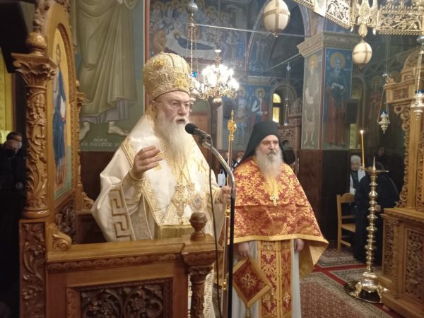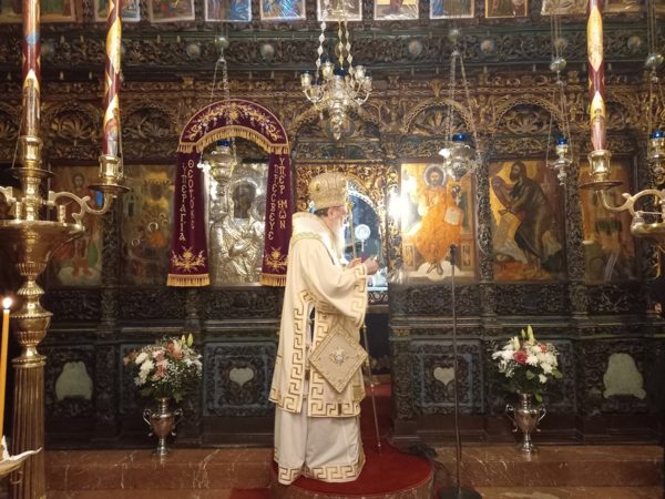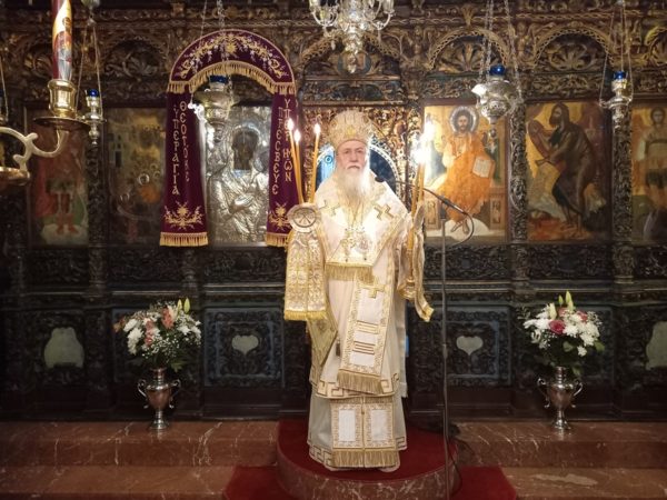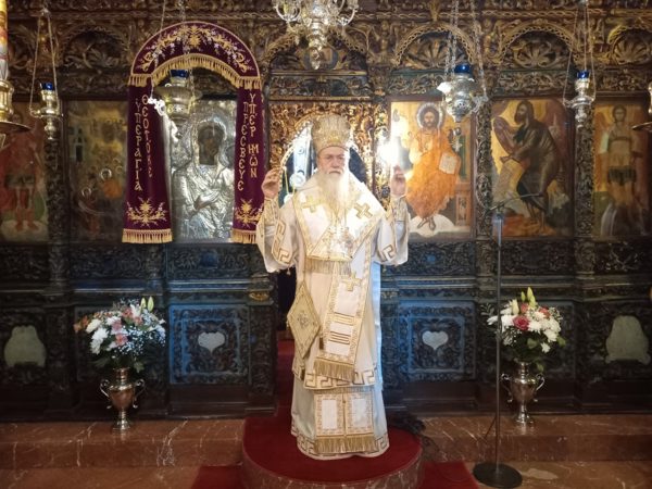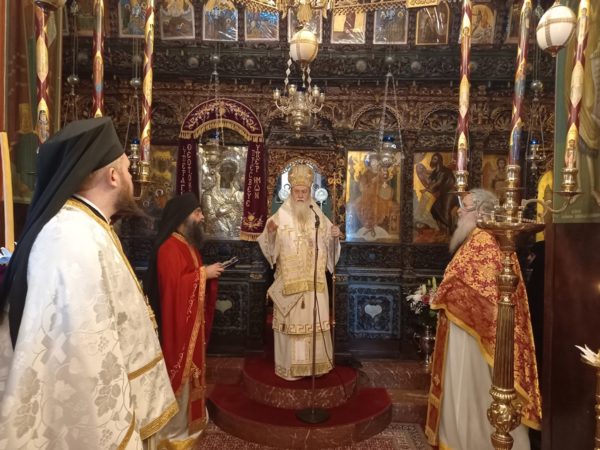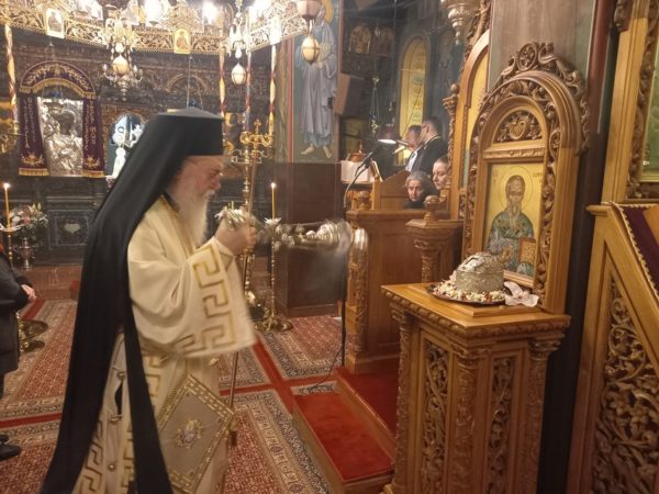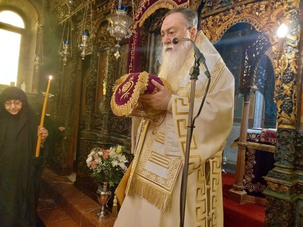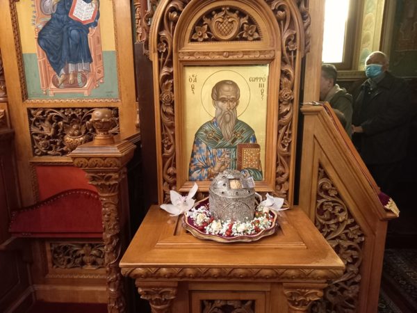 Στο κήρυγμά του προς την Ιερά Αδελφότητα και τους προσκυνητές της Ιεράς Μονής ο Σεβασμιώτατος αναφέρθηκε στον εορταζόμενο Άγιο Σωφρόνιο, ο Οποίος ξεχώρισε και ανεδείχθη πρότυπο αρετής και αγιότητος, υπό την ιδιότητά του ως μοναχού κατ᾿ αρχάς και ως Πατριάρχου Ιεροσολύμων περί τας δυσμάς του βίου του, εξασφαλίζοντας από τον Χαλίφη Ομάρ, τον περίφημο Αχτιναμέ, την κατοχύρωση των δικαιωμάτων του Πατριαρχείου εις τα προσκυνήματα των Ιεροσολύμων. Επιπρόσθετα, διακρίθηκε και για το συγγραφικό του έργο και ειδικότερα τους βίους των Αγίων Αναργύρων Κύρου και Ιωάννου, οι Οποίοι θαυματουργικώς εθεράπευσαν την τύφλωσή του και της Οσίας Μαρίας της Αιγυπτίας, αλλά και τις εξαιρετικές Ευχές του Μεγάλου Αγιασμού των Θεοφανείων ως και την καλλιτέραν και προς το δογματικώς ορθόν διατύπωση της επιλυχνίου ευχαριστίας «Φως ιλαρόν», μαθητευθείς πλησίον αγίων ασκητών και Επισκόπων ως ο Άγιος Ιωάννης ο Ελεήμων, Πατριάρχης Αλεξανδρείας και ο Άγιος Μάξιμος ο Ομολογητής.