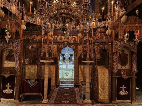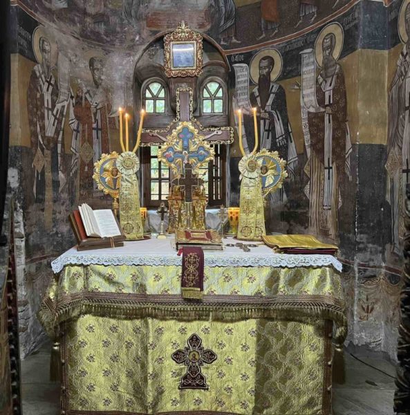 Τον Σεβασμιώτατο υποδέχθηκε στην είσοδο της Ιεράς Μονής η αδελφότητα αυτής, με επικεφαλής τον Καθηγούμενο Αρχιμ. Νικόδημο Αγαθονίκου.