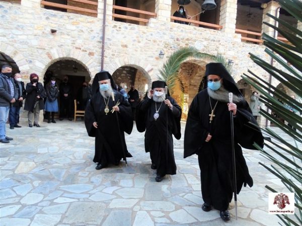 Η εν λόγω Ιερά Μονή είναι κτίσμα του 17ου αιώνα με ωραιότατο ναό (σταυροειδής με τρούλλο) με θαυμάσιες αγιογραφίες και με πολλά ιερά κειμήλια. Ο ηγούμενος της μοναστηριακής αδελφότητος αρχιμανδρίτης π. Εφραίμ Μιλτιάδου, ασμένως υποδέχθηκε μετά της μοναστικής συνοδείας αυτού, τους δύο Σεβασμιωτάτους Μητροπολίτες, ως και πλήθος πιστών προσήλθε και παρακολούθησε την Ακολουθία του Εσπερινού με κατάνυξη αλλά και με την τήρηση των υγειονομικών μέτρων.