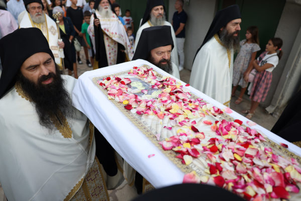 Εν συνεχεία, ακολούθησε λιτάνευση του σώματος της Υπεραγίας Θεοτόκου εντός του αυλείου χώρου της Ιεράς Μονής. Οι εκατοντάδες πιστοί που παρευρέθησαν με δάκρυα στα μάτια προσκύνησαν το σώμα της Παναγίας και για ευλογία πέρασαν κάτω από αυτό και προσκύνησαν τη θαυματουργό εικόνα της Παναγίας της Τρικορφιώτισσας που εορτάζει 15 Αυγούστου.