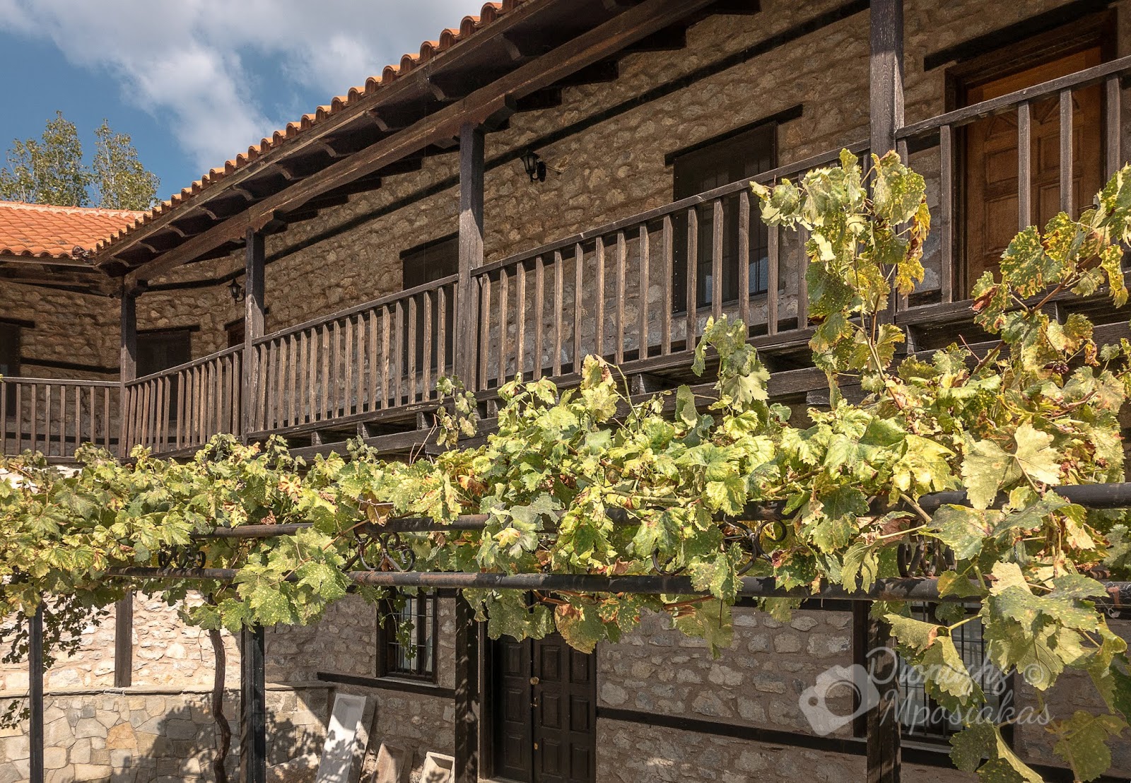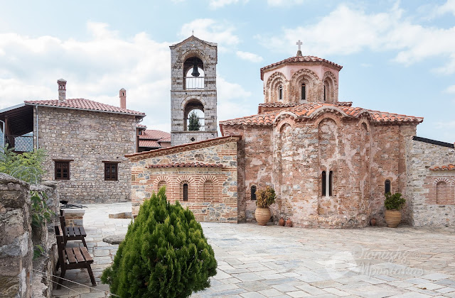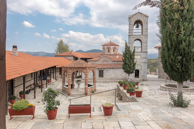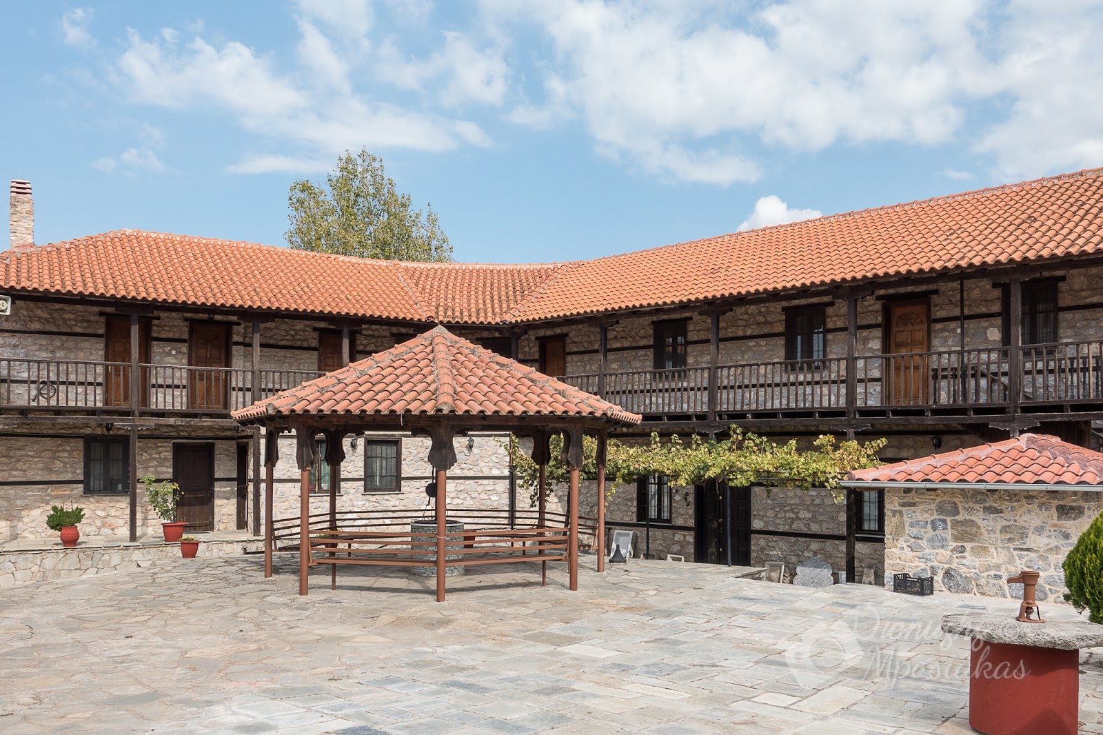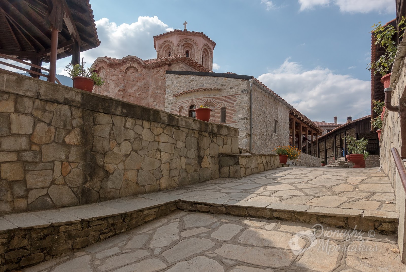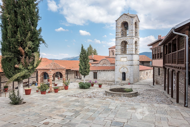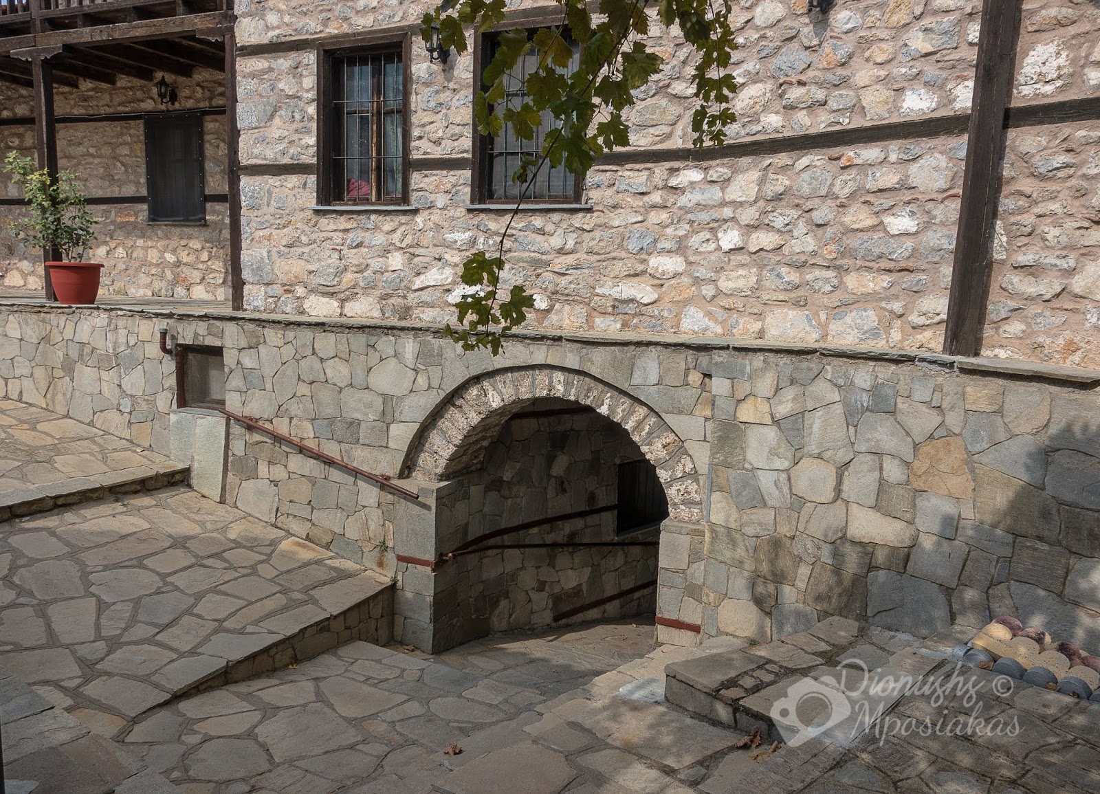 Από την Πύλη του Μοναστηριού εισέρχεται ο επισκέπτης εις τον περίβολο που είναι στρωμένος με σταχτόχρωμους ποταμόλιθους.