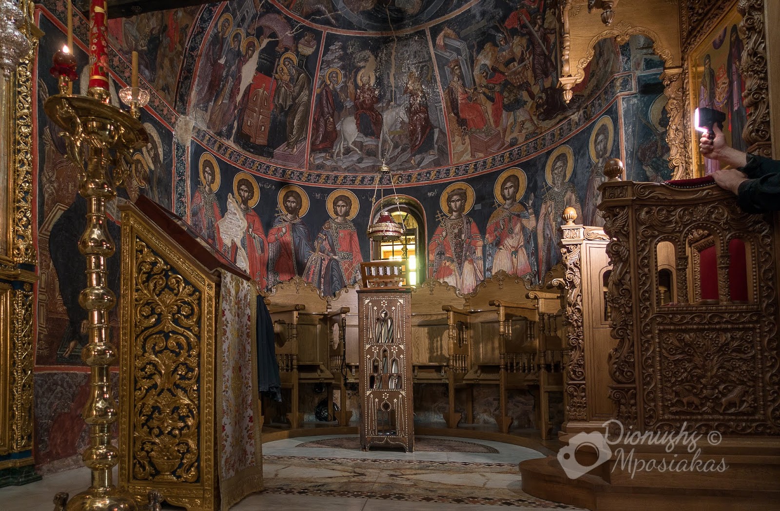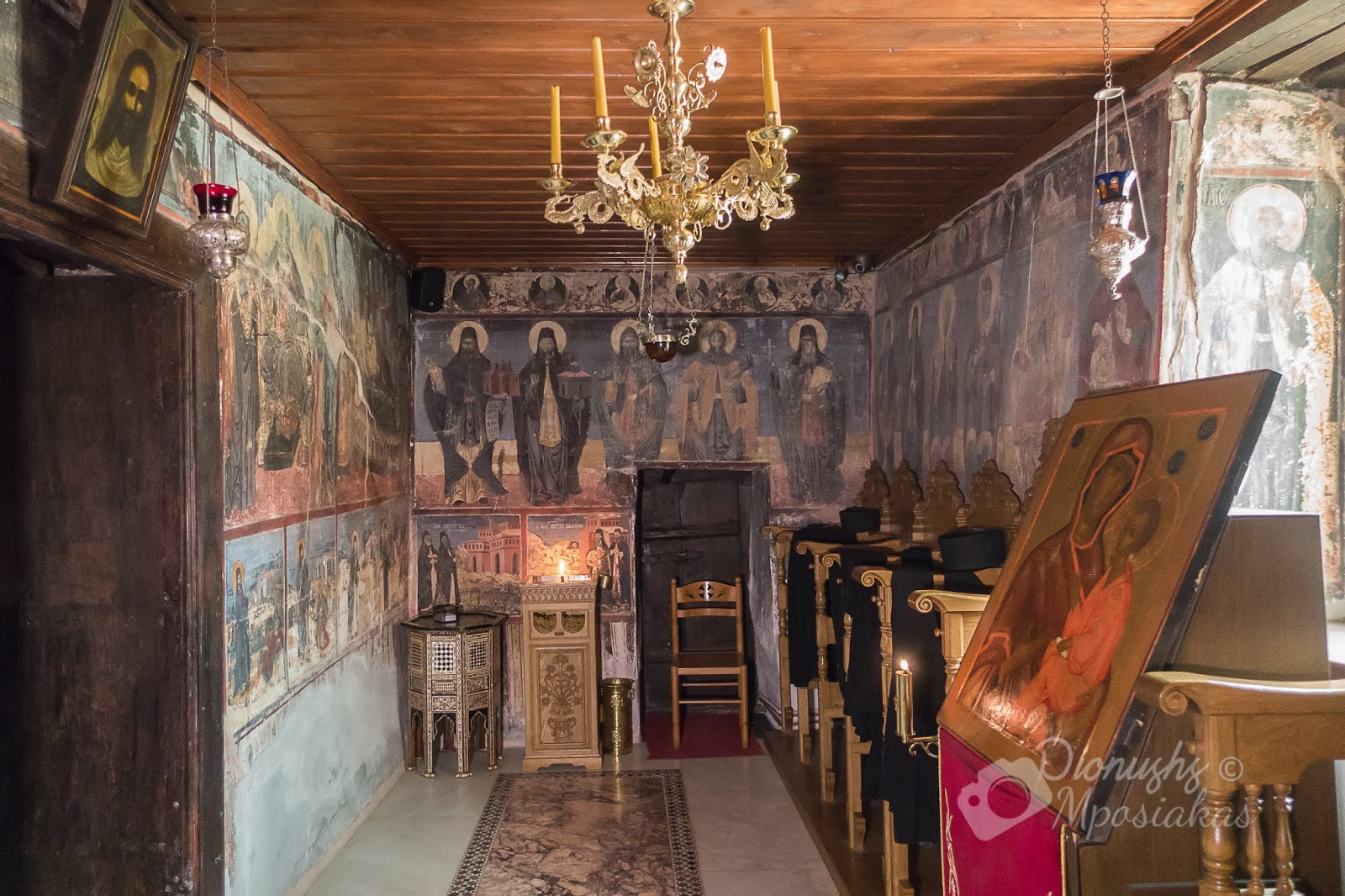 Το εσωτερικό του είναι κατάγραφο από αγιογραφίες των ετών 1869 και 1889 – οι αγιογραφίες αυτές έχουν επικαλύψει τις παλιότερες. Τα αναλόγια και τα προσκυνητάρια έχουν διακόσμηση από «σιντέφι». Στο νάρθηκα του ναού οι τοιχογραφίες (1835) παρουσιάζουν ενδιαφέρον από ιστορική άποψη, αφού εκεί ιστορούνται ο βίος και τα θαύματα του Οσίου Νικάνορα.
