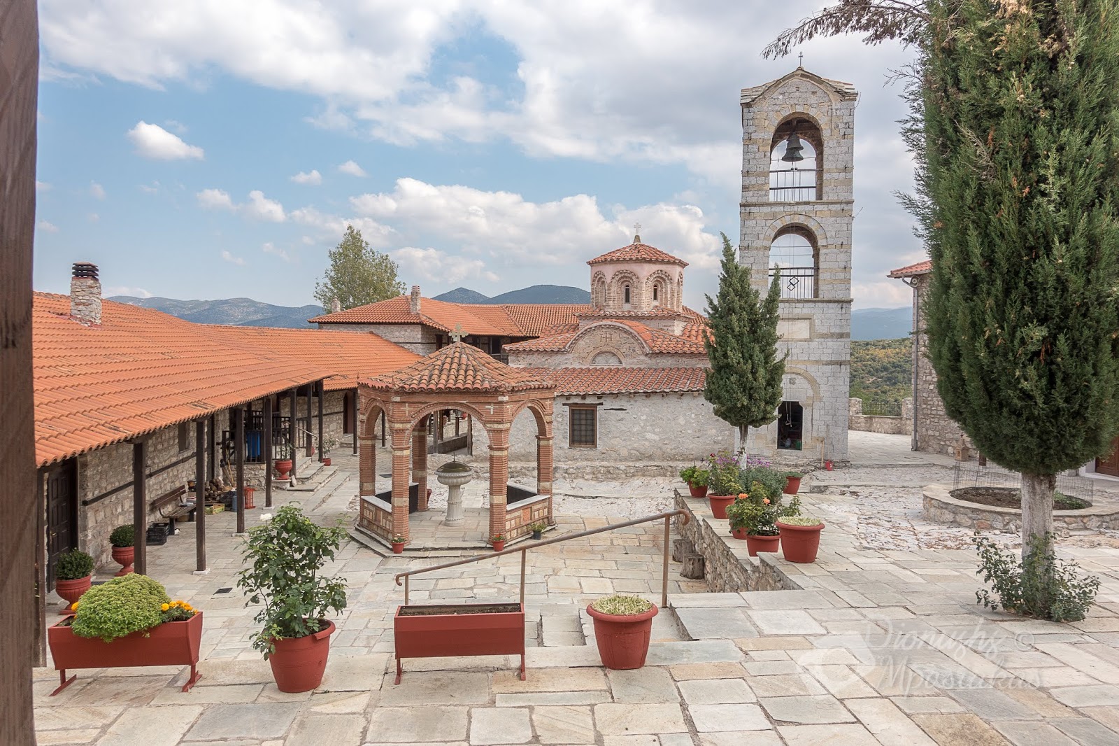 Στους βορειανατολικούς πρόποδες του βουνού υπάρχει μικρό κτιριακό συγκρότημα, η εκκλησία του Αγίου Δημητρίου και οι ξενώνες του Μοναστηριού. Πλακόστρωτος ανηφορικός δρόμος οδηγεί από το συγκρότημα εις την Πύλη του Μοναστηριού.