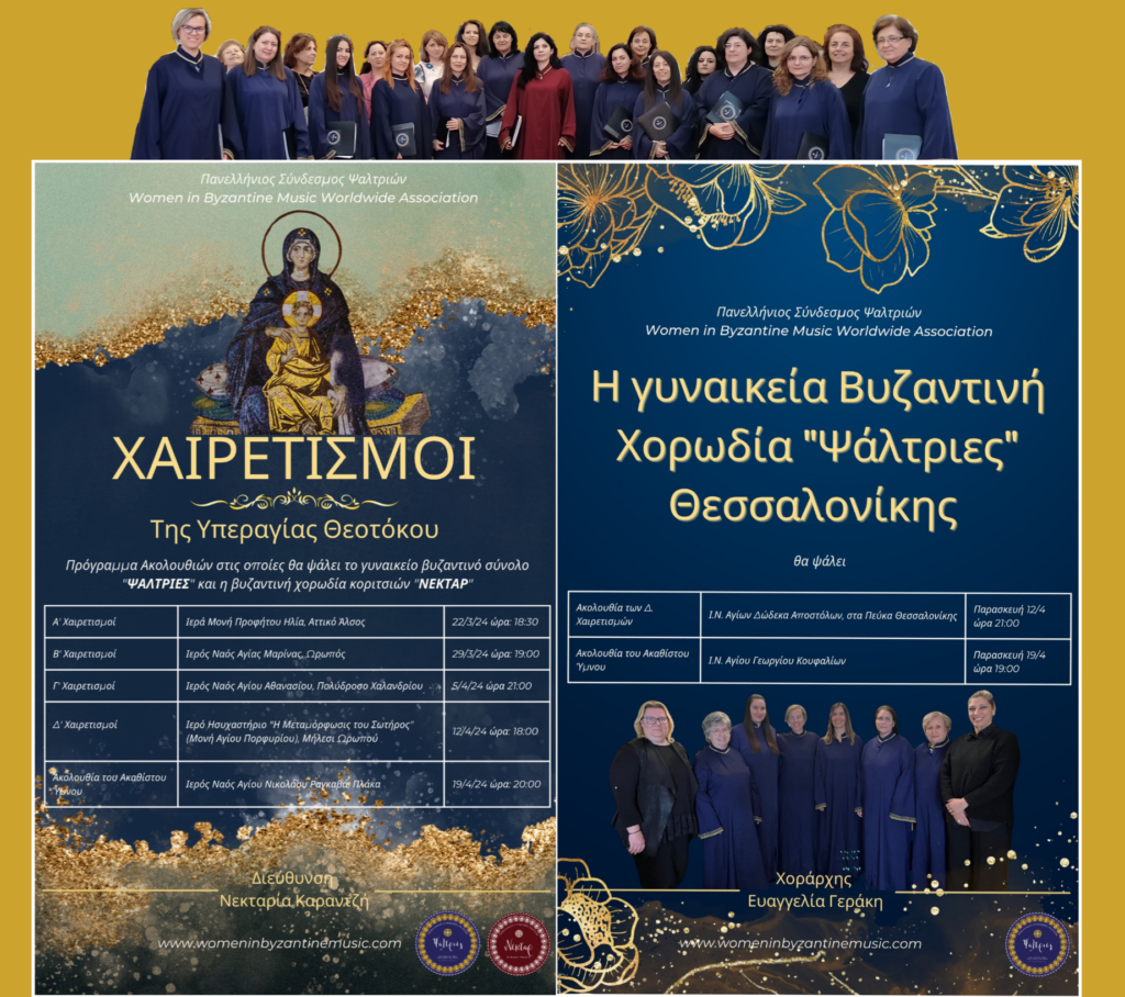 Τα γυναικεία βυζαντινά σύνολα του Πανελληνίου Συνδέσμου Ψαλτριών “Ψάλτριες” Αττικής και Θεσσαλονίκης λαμβάνουν και φέτος, όπως κάθε χρόνο, μέρος ψάλλοντας, στις Ακολουθίες των Χαιρετισμών σε ιερούς ναούς και ιερές μονές Αττικής και Θεσσαλονίκης. Την Παρασκευή 12 Απριλίου θα ψάλλουν στο Μοναστήρι του Αγίου Πορφυρίου στο Μήλεσι Ωρωπού.