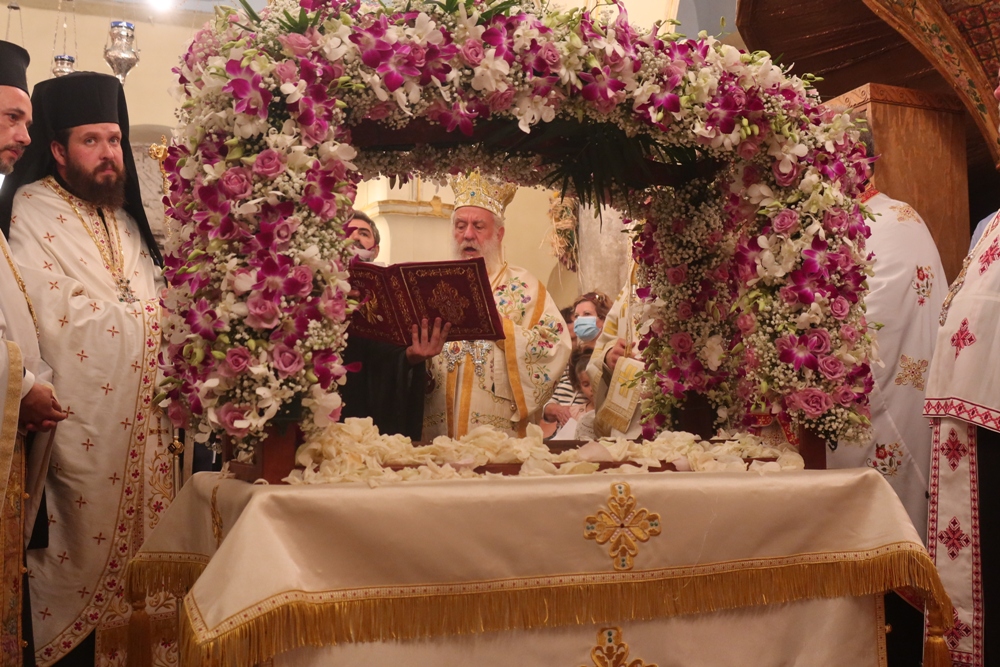 Προ του πέρατος του Εσπερινού, τους ύμνους του οποίου απέδωσε η Βυζαντινή Χορωδία « Αντιφωνικό Μέλος», ο Σεβασμιώτατος κ. Δωρόθεος Β’ , κατά το αρχαίο έθος της Ιεράς Μονής, έψαλε, συναδόντων των πιστών, επί του προευτρεπισμένου Επιταφίου, τα Εγκώμια της Θεοτόκου.