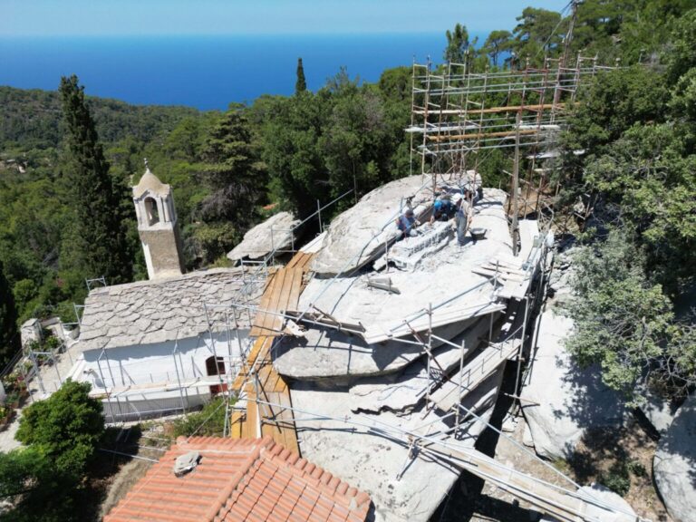 Ολοκληρώθηκαν οι εργασίες του έργου της Ιεράς Μονής Οσίας Θεοκτίστης στην Ικαρία και ήδη είναι ελεύθερος ο χώρος για χρήση αφού εγκρίθηκαν και υλοποιήθηκαν επί πλέον χρήματα για την στερέωση και αποκατάσταση της ζημιάς που υπέστη από τον σεισμό της Σάμου το 2020 ο βράχος της εισόδου στον προαύλιο χώρο.