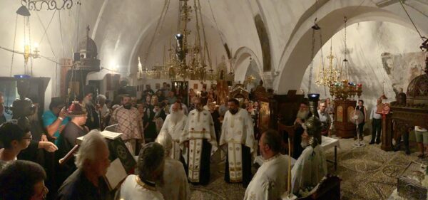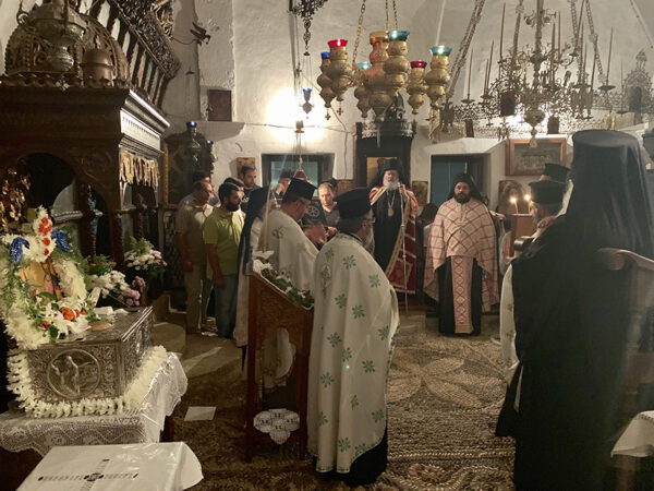 Προηγήθηκαν, νωρίς το απόγευμα, οι Ακολουθίες του Μικρού Εσπερινού και της Παρακλήσεως στον Όσιο, στο σπήλαιο που ασκήτεψε, μπροστά στο επιβλητικό φαράγγι των Περβολακίων, ενώ ακολούθησε η τράπεζα και η Ακολουθία του Μικρού Αποδείπνου.