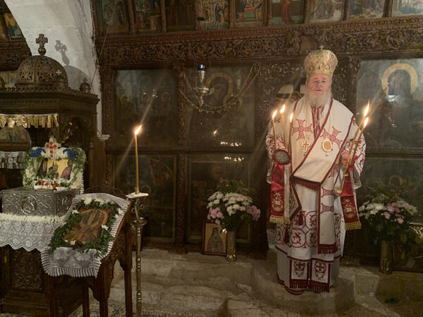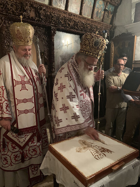 Κατά την ακολουθία του Μεγάλου πανηγυρικού Εσπερινού της εορτής, χοροστάτησε ο Σεβασμιώτατος Ποιμενάρχης κ.κ. Δαμασκηνός και στη συνέχεια μετά την Λιτή και τα απόστιχα ευλόγησε τους προσφερόμενους άρτους. Ακολούθησαν οι Ακολουθίες της Ιεράς Παρακλήσεως προς την Υπεραγία Θεοτόκο και η Ακολουθία του Όρθρου, κατά την οποία ο Σεβ. Ποιμενάρχης χοροστάτησε και εν συνεχεία προέστη στο Αρχιερατικό Συλλείτουργο, κατά το οποίο συνιερούργησε και ο Σεβ. Μητροπολίτης Ιεραπύτνης και Σητείας κ.κ. Κύριλλος, ενώ στο τέλος της Θείας Λειτουργίας έγινε κατά την τάξη και η ευλόγηση του κολλύβου του αγίου.