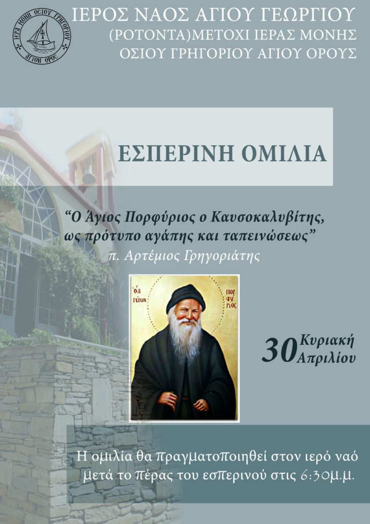 30/04/2023 12/04/2024 Εσπερινή ομιλία με θέμα “Ο Άγιος Πορφύριος ο Καυσοκαλυβίτης, ως πρότυπο αγάπης και ταπεινώσεως” από τον π. Αρτέμιο Γρηγοριάτη θα πραγματοποιηθεί σήμερα στις 18:30 στον Ιερό Ναό Αγίου Γεωργίου (Ροτόντα), Μετόχι Ιεράς Μονής Οσίου Γρηγορίου Αγίου Όρους.