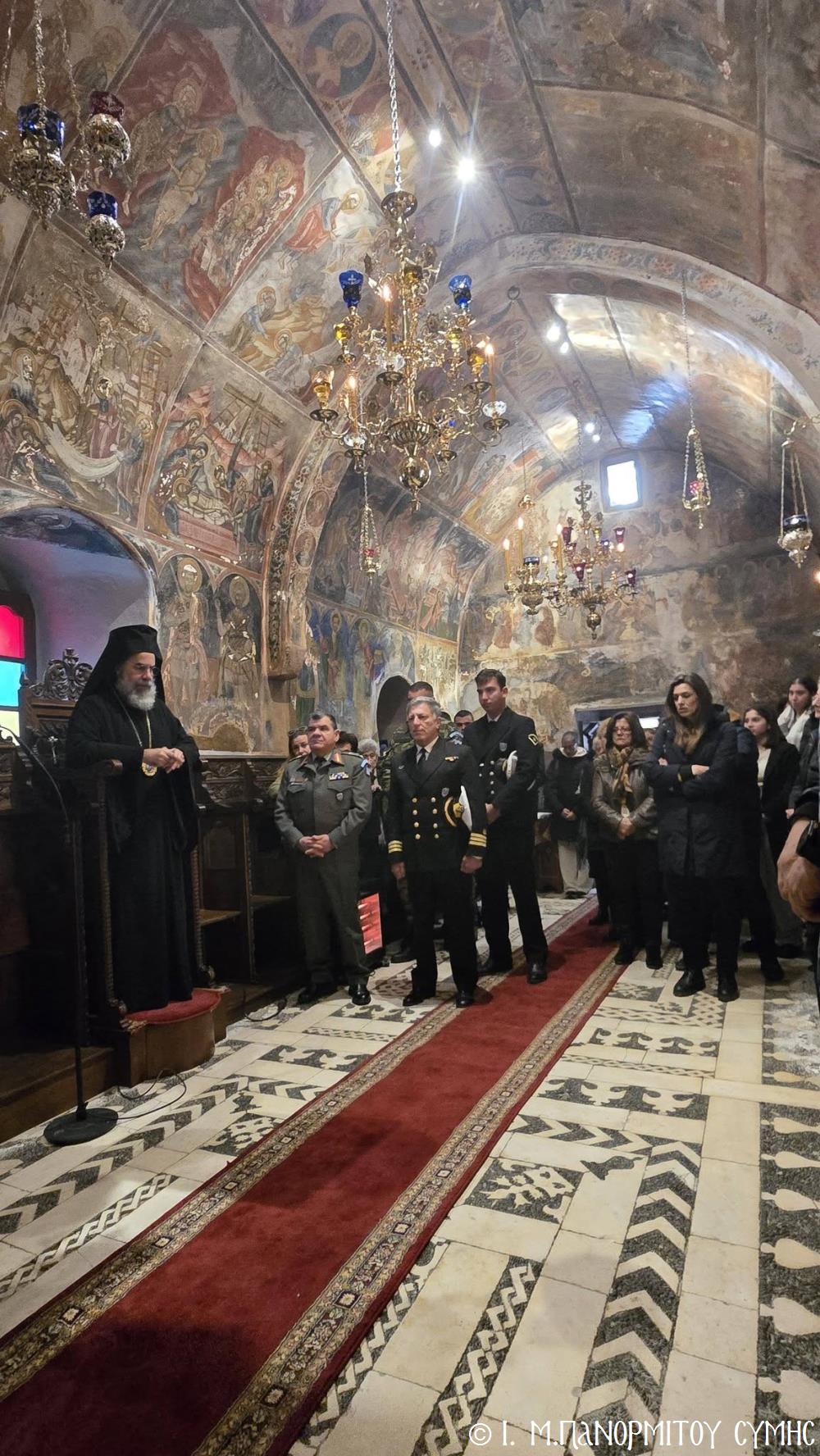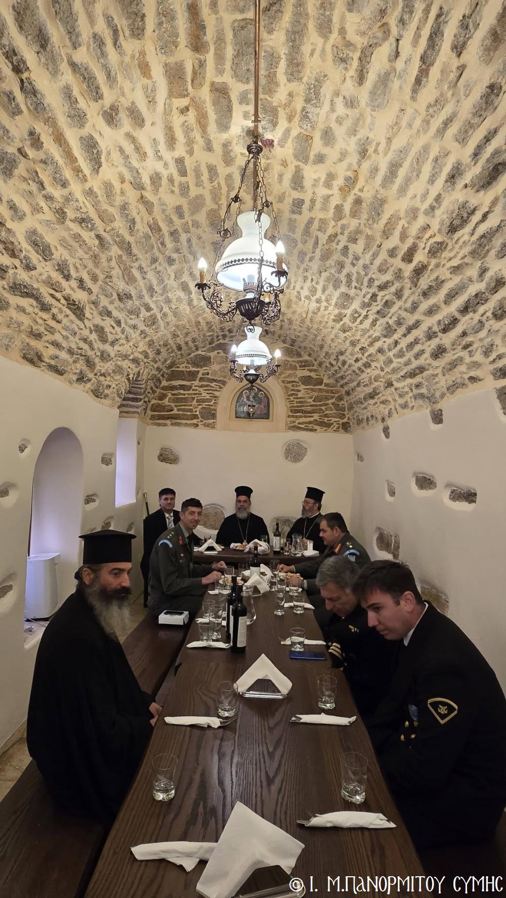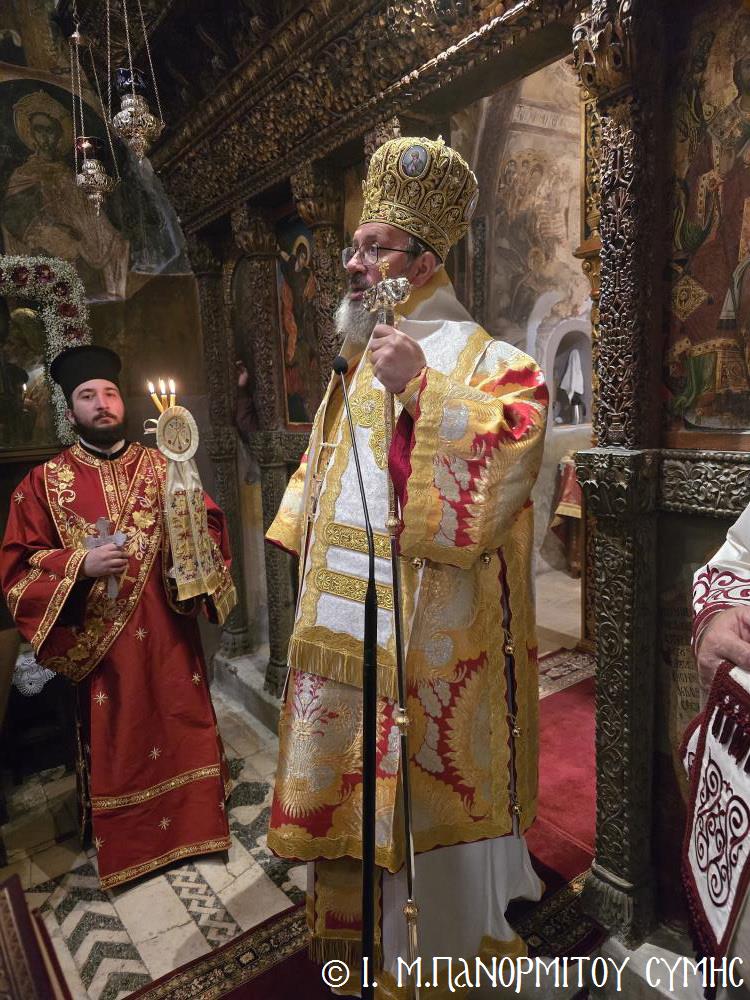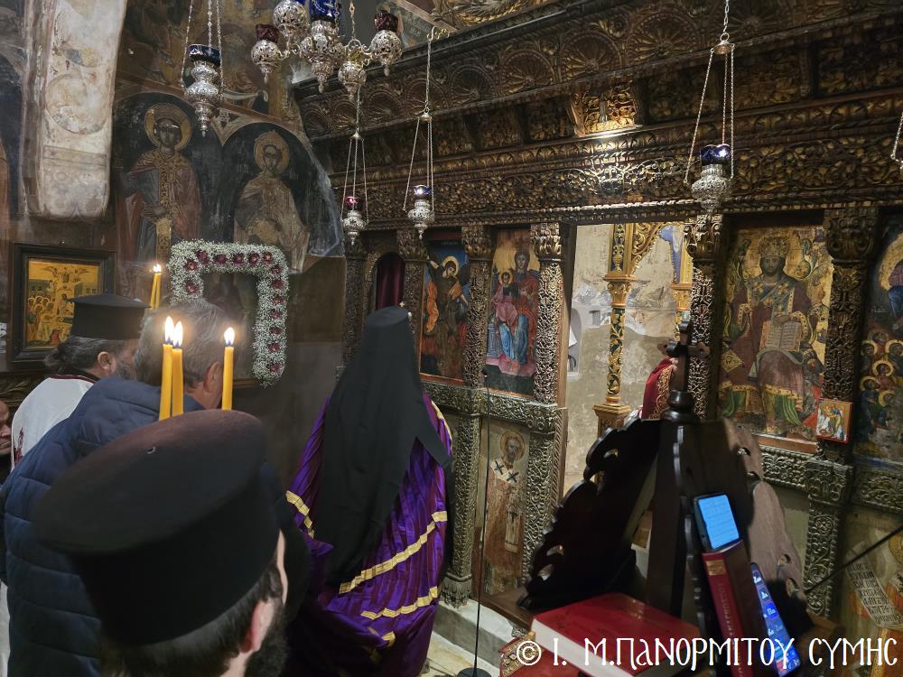 Ακολούθως ο Σεβασμιώτατος ευχήθηκε τα δέοντα στον εορτάζοντα Βοηθό Του Επίσκοπο, αναφερόμενος στην εύορκη ως Κληρικού πολυετή διακονία του, καθώς και στο υγιές εκκλησιαστικό του φρόνημα, διά των οποίων με την Χάρη του Θεού και του Ταξιάρχου, υπηρετεί με αυταπάρνηση, πλέον ως Επίσκοπος, την ακριτική μας Ιερά Μητρόπολη και την ιστορική Μονή του Πανορμίτου.