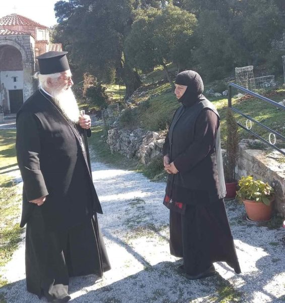 Δεν παρέλειψε να ευχηθεί δεόντως στην εορτάζουσα Γερόντισσα και να την ενδυναμώσει στο έργο της αναστηλώσεως του ιστορικού αυτού τόπου.