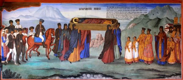 «Μετά, αφού αναχώρησαν από εκεί, ήρθαν στο μοναστηριακό μετόχι, ονομαζόμενο Ορλίτσα και στην εκκλησία Αγίων Αποστόλων, την οποία ο ίδιος ηγούμενος του μοναστηριού Νταβίντ ανήγειρε εκ θεμελίων σ’ αυτόν τον τόπο, έθεσαν το τίμιο φέρετρο του αξιοσέβαστου, επειδή την επόμενη ημέρα ήταν η γιορτή των Πρωτοκορυφαίων Αποστόλων Πέτρου και Παύλου. Και γιόρτασαν με το λαό, τίμησαν την ημέρα και απέδωσαν έπαινο ευγνωμοσύνης προς τον Θεό. Αφού αναχώρησαν, την άλλη ημέρα, η οποία ήταν 30η Ιουνίου, ξανά ο ηγούμενος με τους ιερείς και τον επίσκοπο του Κρούπνικ κ. Ιωσήφ, ο οποίος ήταν δικός του αδερφός εξ αίματος, πήρε το φέρετρο και το περιέφερνε, ενώ ο λαός ακολουθούσε με τα πόδια και φώναζε «Κύριε ελέησον», μέχρι την γέφυρα του μετοχίο». Μερικά χρόνια αργότερα ένα μέρος του ναού ζωγραφίστηκε, ενώ η τελική του διακόσμηση ολοκληρώθηκε κατά το έτος 1491 με χρήματα του επισκόπου του Κρούπνικ – Ιάκοβ, στα χρόνια του γνωστού ηγουμένου της Ρίλας Θεόκτιστου. Η καινούρια εικονογράφηση της εκκλησίας είναι έργο του Νικόλα Ομπραζοπίσοβ από την πόλη Σάμοκοβ και χρονολογείται από το έτος 1863. Η θριαμβευτική σύνθεση του ίδιου «Επιστροφή των λειψάνων του Αγίου Ιωάννη της Ρίλας του Θαυματουργού» βρίσκεται στο νάρθηκα του ναού. Οι τοιχογραφίες από τον 15ο αιώνα διατηρήθηκαν στο Ιερό Βήμα και πάνω από την πόρτα στο ναό της εκκλησίας.