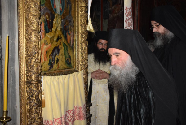 «Πανοσιολογιώτατε Καθηγούμενε τῆς Ἱερᾶς καὶ θεοφρουρήτου ταύτης Μονῆς πάτερ Βησσαρίων. Ὁ Χριστός ὡς σαρκωμένη Ἐκκλησία, ἕνωση δηλαδὴ Θεοῦ καὶ ἀνθρώπων, Ἀκτίστου καὶ κτιστοῦ, παρατείνεται μέσα στοὺς αἰῶνες τῆς ἀνθρώπινης ἱστορίας ἐν Ἁγίῳ Πνεύματι.