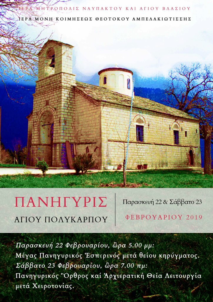 Την μνήμη του Αγίου Πολυκάρπου Επισκόπου Σμύρνης θα πανηγυρίσει η Ιερά Μονή Κοιμήσεως Θεοτόκου Αμπελακιωτίσσης. Ακολουθεί η αφίσα με το αναλυτικό πρόγραμμα των λατρευτικών εκδηλώσεων.