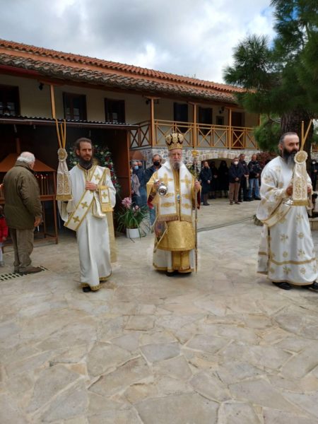Την δε κυριώνυμο ημέρα της εορτής, Πέμπτη 10 Φεβρουαρίου 2022, τελέσθηκε το Αρχιερατικό Συλλείτουργο προεξάρχοντος του Σεβασμιωτάτου Μητροπολίτου Καρυστίας και Σκύρου κ. Σεραφείμ συνιερουργούντος του Σεβασμιωτάτου Μητροπολίτου Ειρηνουπόλεως κ. Νικάνδρου με συλλειτουργούς τον Πρωτοσύγκελο Πανοσ Αρχιμ Νικόδημο Πόγκα τους ιερείς και διακόνους με την παρουσία της Ηγουμένης της ιεράς μονής Θεολογίας μοναχής και της μοναστικής αδελφότητος.
