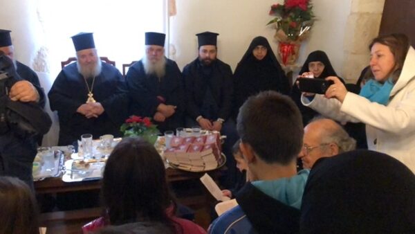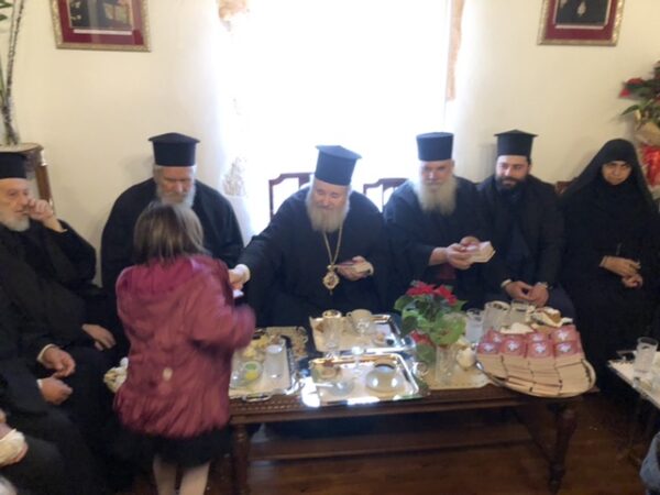 Να σημειωθεί επίσης ότι μέσα στο κατάμεστο από πλήθος κόσμου Ηγουμενείο, μία ομάδα παιδιών έψαλλε τα κάλαντα στον στον Σεβασμιώτατο Ποιμενάρχη μας και πήραν την ευχή του αφού τα ευχαρίστησε για αυτή την ευχάριστη έκπληξη.