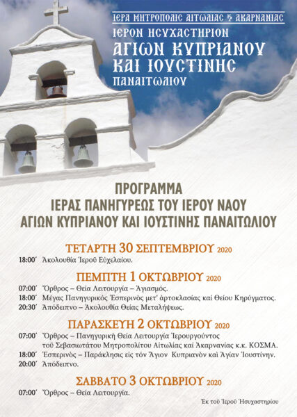 Ενώ την Παρασκευή 2 Οκτωβρίου 2020 η αγία μας Εκκλησία τιμά την μνήμη των Αγίων Κυπριανού και Ιουστίνης. Στην Ιερά Μητρόπολη Αιτωλίας και Ακαρνανίας και τον Ιερό Ναό Αγίων Κυπριανού και Ιουστίνης Παναιτωλίου το πρόγραμμα του εορτασμού θα έχει ως εξής: