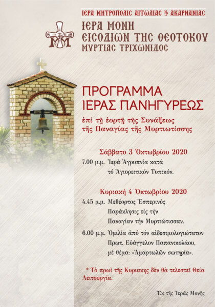 Τη Κυριακή 4 Οκτωβρίου και ώρα 4.45 μ.μ. θα τελεστεί Μεθέορτος Εσπερινός και Παράκλησις στην Παναγία την Μυρτιωτίσσα και στις 6.00 μ.μ. θα πραγματοποιηθεί ομιλία από τον αιδεσιμολογιότατο Πρωτ. Ευάγγελο Παπανικολάου, με θέμα: «Αμαρτωλών σωτηρία».
