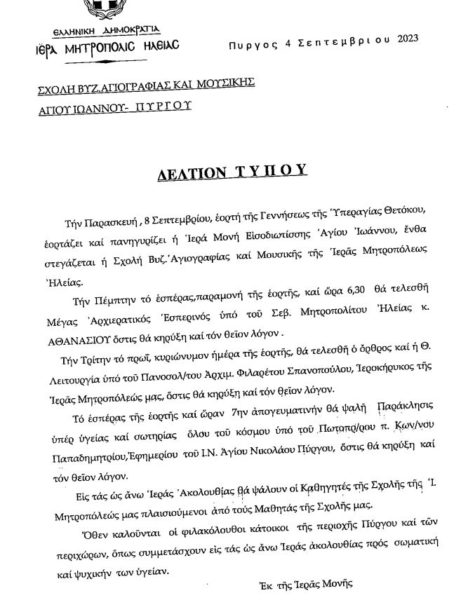 Την Παρασκευή, 8 Σεπτεμβρίου, εορτή της Γεννήσεως της Υπεραγίας Θεοτόκου, εορτάζει και πανηγυρίζει η Ιερά Μονή Εισοδιωτίσσης Αγίου Ιωάννου, δίπλα στην οποία στεγάζεται η Σχολή Βυζαντινής Αγιογραφίας και Μουσικής της Ιεράς Μητροπόλεως Ηλείας.