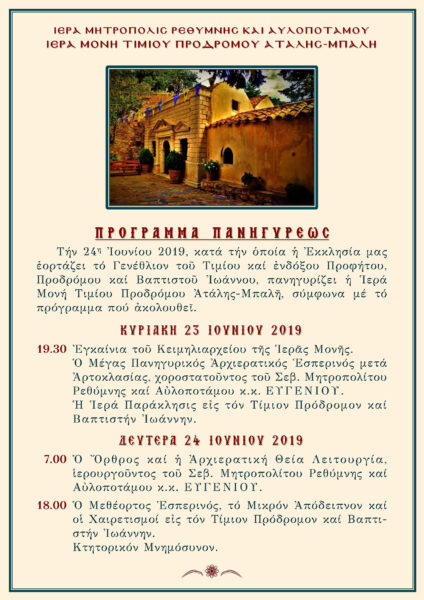 Την Δευτέρα 24 Ιουνίου 2019, κατά την οποία η Εκκλησία μας εορτάζει το Γενέθλιον του Τιμίου και ενδόξου Προφήτου, Προδρόμου και Βαπτιστού Ιωάννου, πανηγυρίζει η Ιερά Μονή Τιμίου Προδρόμου Ατάλης-Μπαλή, σύμφωνα με το πρόγραμμα που ακολουθεί: