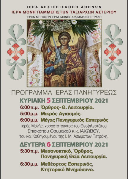 Τη Δευτέρα, 6 Σεπτεμβρίου, πανηγυρίζει η Ιερά Μονή Παμμεγίστων Ταξιαρχών Αστερίου την ανάμνηση του θαύματος του Αρχαγγέλου Μιχαήλ στις Χωναίς (ή Κολασσαίς). Η πανήγυρη θα αρχίσει με αγιασμό αύριο το απόγευμα στις 5, ενώ ακολούθως θα τελεσθεί ο Μέγας Πανηγυρικός Εσπερινός, χοροστατούντος του Θεοφιλεστάτου Επισκόπου Θαυμάκου κ. Ιακώβου, ο οποίος είναι και καθηγούμενος της Ι.Μ. Ασωμάτων Πετράκη.