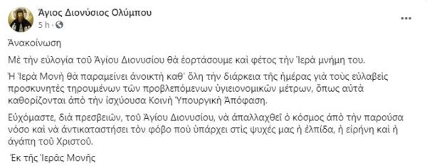 «Ο Σεβασμιώτατος Μητροπολίτης μας κ. Γεώργιος προτρέπει για την τήρηση των μέτρων προστασίας και επικαλείται για όλους τους ευλαβείς χριστιανούς την ευλογία του Αγίου Διονυσίου, προστάτη και εφόρου όλης της Πιερίας».