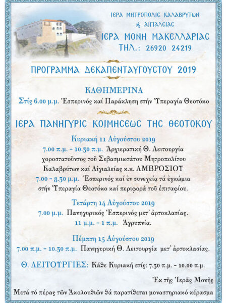 Σύμφωνα με το πρόγραμμα που ανακοινώθηκε, καθημερινά θα τελείται στις 6 το απόγευμα εσπερινός και παράκληση στην Υπεραγία Θεοτόκο, ενώ την Κυριακή 11 Αυγούστου 2019 το πρωί θα τελεστεί αρχιερατική Θεία λειτουργία χοροστατούντος του σεβασμιοτάτου Μητροπολίτη Αιγιαλείας και Καλαβρύτων κ.κ. Αμβροσίου. Την ίδια μέρα στις 7 το απόγευμα, θα τελεστεί εσπερινός και θα ψαλούν τα εγκώμια στην Παναγία ενώ θα γίνει και περιφορά του Επιταφίου.