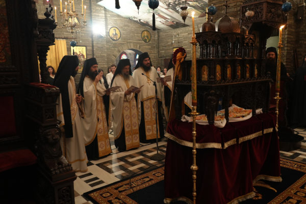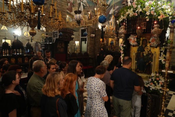 Την παραμονή της εορτής στο τέλος του πανηγυρικού Εσπερινού ψάλθηκαν κατά το Ιεροσολυμίτικο τυπικό τα εγκώμια της Θεοτόκου, μπροστά στον Επιτάφιο της Θεοτόκου και εν συνεχεία ακολούθησε η λιτάνευση του επιταφίου μέσα στον αύλειο χώρο της Ιεράς Μονής.