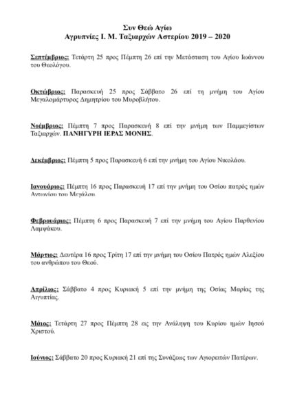 Πρόγραμμα Αγρυπνιών Ι. Μετοχίου Ταξιαρχών Αστερίου 2019-2020, καθώς αυτό επισυνάπτεται παρακάτω: