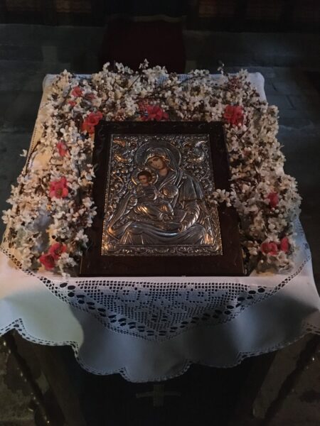 Στην Γυναικεία Ιερά Κοινοβιακή Μονή Τίμιου Προδρόμου Ανατολής Αγιάς – Λαρίσης, οι Μοναχές προσευχόμενες στόλισαν την εικόνα της Υπεραγίας Θεοτόκου, με άνθη από άγριες κορομηλιές που φύονται στις πλαγιές του όρους Κίσσαβος.