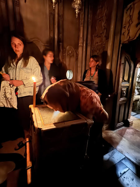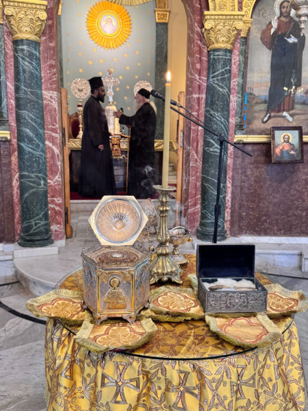 Τέλος, το βράδυ έφθασαν στο Θεοβάδιστο Όρος Σινά, στην Ιερά Μονή Αγίας Αικατερίνης. Την άλλη ημέρα το πρωί, πήγαν στα Ιεροσόλυμα, όπου προσκύνησαν τον Πανάγιο Τάφο, το Φρικτό Γολγοθά και άλλα ευλογημένα προσκυνήματα της Ιερουσαλήμ. Την επόμενη ημέρα προσκύνησαν στο Σπήλαιο της Βηθλεέμ όπου γεννήθηκε ο Χριστός, στο μοναστήρι του Μεγάλου Θεοδοσίου και Σάββα του Ηγιασμένου.