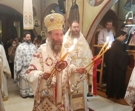 Ο Σεβασμιώτατος αναφέρθηκε επίσης στον βίο της Οσίας Ειρήνης και στο ζωντανό παράδειγμά της, τονίζοντας ιδιαίτερα δύο λέξεις από το απολυτίκιό της, ότι δηλαδή η Οσία υπάρχει πάντα “προσφυγή” και “βοήθεια” σε όλους τους ανθρώπους που την επικαλούνται αληθινά και καρδιακά.