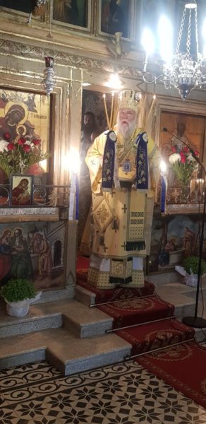 Κατά την θεία λειτουργία ο Σεβασμιώτατος έλαβε αφορμή από το ευαγγελικό ανάγνωσμα και ανέπτυξε τρεις έννοιες. Θαρσείτε, εγώ ειμί, μη φοβείσθε, λόγοι του Κυρίου μας Ιησού Χριστού που καθησύχασε τους μαθητές Του οι οποίοι έχασαν το θάρρος τους και τους κατέλαβε ο φόβος, όταν στο πλοίο το οποίο επέβαιναν κινδύνευε από την τρικυμία της θάλασσας.