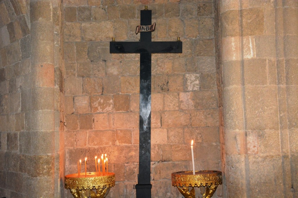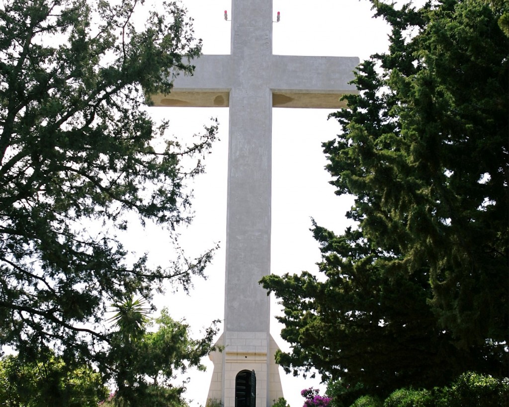Απέναντι από την κεντρική είσοδο που οδηγεί στον ναό της Παναγίας ξεκινάει η αλέα του λεγόμενου “δρόμου του Γολγοθά”, έργο του 1934. Πρόκειται για ένα λιθοστρωμένο διάδρομο στη βόρεια πλευρά του οποίου διατάσσονται συμμετρικά δεκατέσσερα προσκυνητάρια που ιστορούν σε χαλκογραφία τα πάθη του Χριστού. Ο δρόμος οδηγεί σε πλάτωμα στο οποίο δεσπόζει υπερμεγέθης σταυρός συνολικού ύψους 16μ. Ο σταυρός της περιόδου της ιταλοκρατίας κατεδαφίστηκε στη διάρκεια του Β΄ Παγκοσμίου Πολέμου, καθώς αποτελούσε σημείο αναφοράς των συμμαχικών αεροπλάνων και ανακατασκευάστηκε μεταξύ 1994-1996.