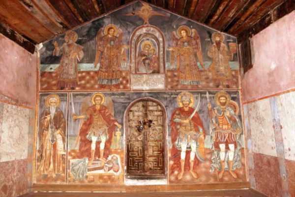 Στους τοίχους οι εικονογραφίες είναι σε δύο ζώνες: στην άνω γραμμή απεικονίζονται παραστάσεις της Καινής Διαθήκης, ενώ στην κάτω γραμμή – εικόνες αγίων-στρατιωτών και σεβασμιοτάτων. Στον κάτω όροφο βρίσκεται το οστεοφυλάκιο. Εκεί διατηρούνται τα λείψανα των αποθανόντων μοναχών της Ρίλας. Στους τοίχους δεν υπάρχουν τοιχογραφίες. Οι τοίχοι κτίστηκαν με πέτρα και κονίαμα και έχουν πάχος 1 μ. Η είσοδος του οστεοφυλακίου σφραγίστηκε με τοίχο λόγω κινδύνου κατάρρευσης.