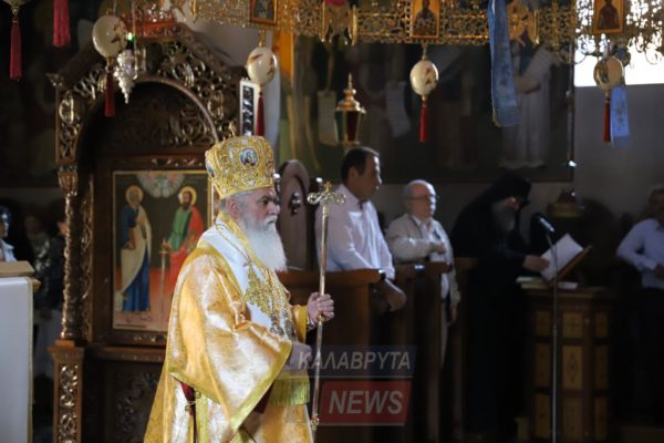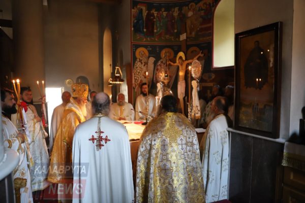 Της Θείας Λειτουργίας που τελέστηκε στο Καθολικό της Μονής προέστη ο Μητροπολίτης Καλαβρύτων και Αιγιαλείας κ. Ιερώνυμος. Συλλειτούργησαν κληρικοί της ευρύτερης περιοχής.