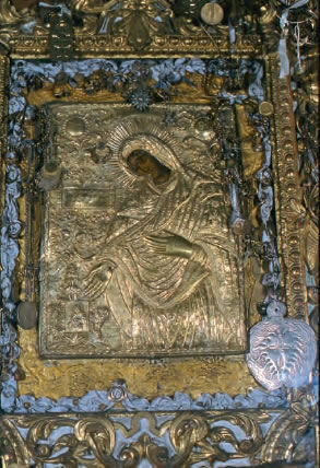 Ἡ Παναγία, ὡστόσο, συνδέεται, ἀμεσότερα ἐδῶ, μέ τίς ὁλόσωμες μορφές ὀκτώ μαρτύρων, πού τήν περιβάλλουν, στά ἰσάριθμα διάχωρα πού σχηματίζουν οἱ νευρώσεις τοῦ τρουλλίσκου. Αὐτοί εἶναι: οἱ ἅγιοι Σέργιος καί Βάκχος, ὁ Θεόδωρος ὁ Στρατηλάτης, καί οἱ ἅγιοι Πέντε Μάρτυρες (Εὐστράτιος, Αὐξέντιος, Εὐγένιος, Μαρδάριος καί Ὀρέστης), πού μαρτύρησαν, ἐπί Διοκλητιανοῦ, στή Σεβάστεια. Ἡ ἐπιλογή αὐτή συμπληρώθηκε μέ τά στηθάρια τοῦ Νικήτα καί τοῦ Μηνᾶ στίς κορυφές τοῦ βορείου καί νοτίου τόξου. Τά δύο αὐτά πορτραῖτα ἀποσυνδέονται κατά κάποιο τρόπο ἀπό τή σειρά τῶν μοναστικῶν ἁγίων, πού παριστάνονται πάλι, σέ κυκλικά πλαίσια, στά ἐσωρράχια τῶν τόξων: ὁ Μηνᾶς βλέπει πρός βορρᾶν καί ὁ Νικήτας πρός νότον, δηλαδή πρός τό κεντρικό τμῆμα ὅπου δεσπόζει ἡ Παναγία μέ τούς μάρτυρες (ἐνῶ οἱ μοναστικοί ἅγιοι στά τόξα βλέπουν εἴτε πρός ἀνατολάς εἴτε πρός δυσμάς). Ἡ ἀπεικόνιση στρατιωτικῶν ἁγίων καί γενικότερα μαρτύρων ἀξιωματούχων κοντά στήν Παναγία εἶναι ἐντελῶς ἀσυνήθιστη ὡς τρουλλαία διακόσμηση καί παραπέμπει σέ φορητές εἰκόνες. Σ’ ἕνα σύντομο ἀνώνυμο ἐπίγραμμα πού, ἴσως, περιέγραφε μιά τέτοια εἰκόνα, παραγγελία τοῦ Κωνσταντίνου Μονομάχου, διαβάζουμε: «(Εἰς τήν εἰκόνα τῆς ἀκαταμαχήτου Θεοτόκου ἥν κατεσκεύασε Κωνσταντῖνος Βασιλεύς ὁ Μονομάχος. Εἰσί δέ οἱ στίχοι ἀπό προσώπου τῆς εἰκόνος:)» Τήν ἀκαταμάχητον, ὦ Μονομάχε, / ἐν ταῖς μάχαις ἔχων μέ σύμμαχον μάχου.»