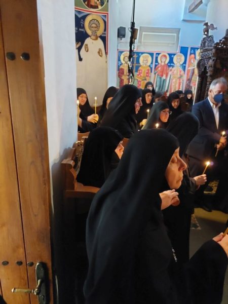 Στο ιερό αναλόγιο έψαλαν οι αδελφές της Ιεράς Μονής Κοιμήσεως Θεοτόκου Κορμπόβου, οι οποίες απέδωσαν μελίρρυτα τους ιερούς ύμνους.