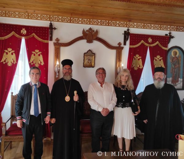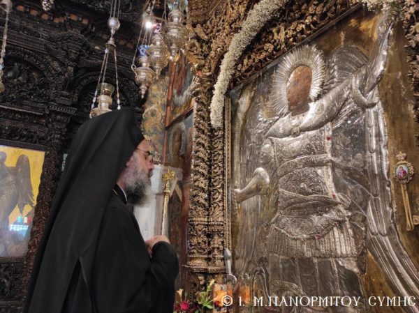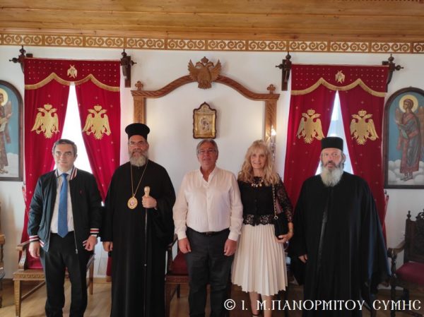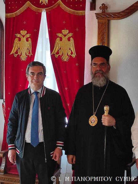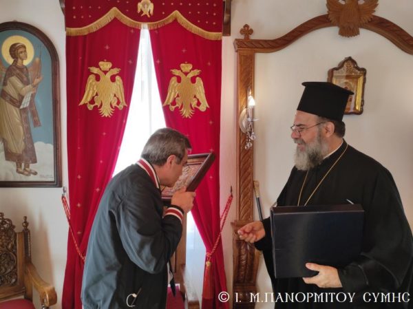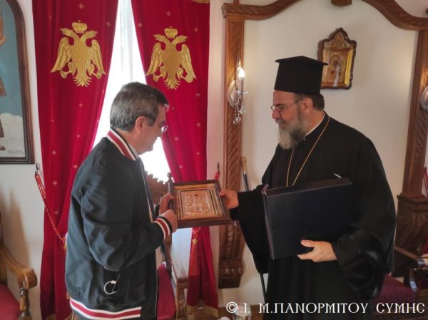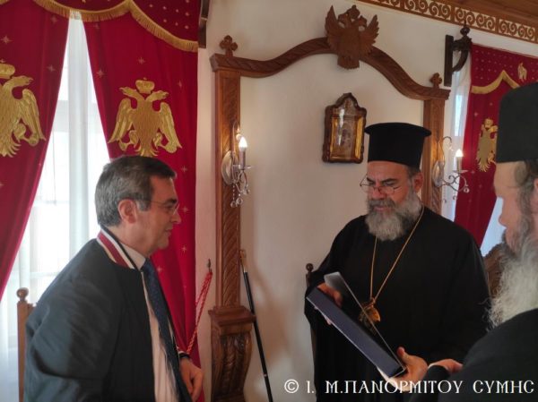 Μετά την Απόλυση με την φιλόξενη μέριμνα του Πανοσιολ. Καθηγουμένου, ο Σεβασμιώτατος Μητροπολίτης Σύμης κ. Χρυσόστομος δεξιώθηκε τον κ. Υπουργό στο Δεσποτικό της Μονής, όπου του προσέφερε τιμής και ευλογίας ένεκα αργυρό αντίγραφο της Εικόνος του Ταξιάρχου.