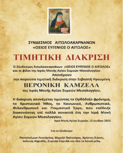 Ακολούθησε μια απλή, σεμνή και λιτή εκδήλωση, έτσι ακριβώς όπως άρμοζε στην Ηγουμένη Βερονίκη, από τον Σύνδεσμο Αιτωλοακαρνάνων «ΟΣΙΟΣ ΕΥΓΕΝΙΟΣ Ο ΑΙΤΩΛΟΣ» και τους φίλους του Μοναστηριού. Ο Σύνδεσμος, δια του Προέδρου του, παρέδωσε Τιμητική Διάκριση τιμώντας την Ηγουμένη Βερονίκη Καμζέλα, για το Ορθόδοξο φρόνημα, το Χριστιανικό Ήθος, το Κοινωνικό, Ανθρωπιστικό, Φιλανθρωπικό και Ποιμαντικό της έργο, που επέδειξε διακονώντας επί πολλά έτη την Ιερά Μονή του Αγίου Συμεών – Μεσολογγίου.