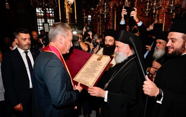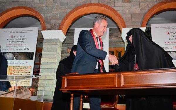 Η τελετή ξεκίνησε με Δοξολογία στο Καθολικό της Μονής ενώ ακολούθησε η απονομή του Μεγαλόσταυρου της Ιεράς Μητρόπολης Δράμας στον κ. Στήβεν Γκριν. “Έχετε δώσει το παράδειγμα προς τους άλλους να ακολουθήσουν τον ίδιο δρόμο με εσάς και προσευχόμαστε να κάνουν το ίδιος και προσευχόμαστε να το κάνουν”, επεσήμανε ο Αρχιεπίσκοπος κ. Ελπιδοφόρος.