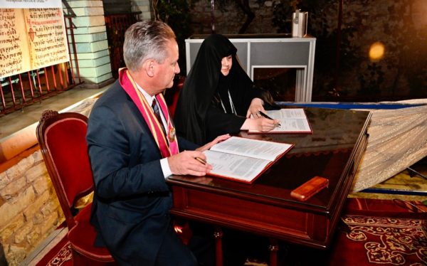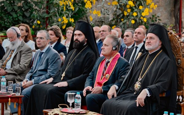Η τελετή ξεκίνησε με Δοξολογία στο Καθολικό της Μονής ενώ ακολούθησε η απονομή του Μεγαλόσταυρου της Ιεράς Μητρόπολης Δράμας στον κ. Στήβεν Γκριν. “Έχετε δώσει το παράδειγμα προς τους άλλους να ακολουθήσουν τον ίδιο δρόμο με εσάς και προσευχόμαστε να κάνουν το ίδιος και προσευχόμαστε να το κάνουν”, επεσήμανε ο Αρχιεπίσκοπος κ. Ελπιδοφόρος.