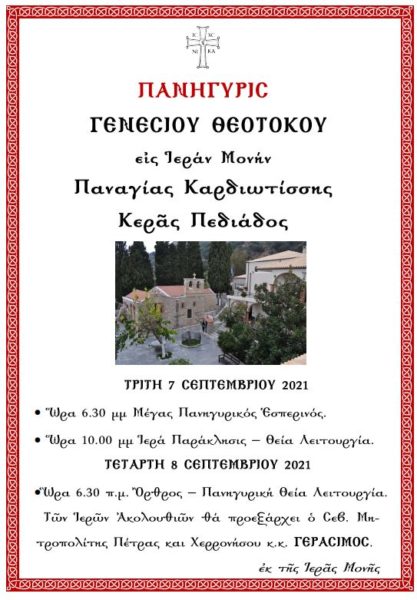 Το Γενέσιο της Θεοτόκου θα εορτάσει η Ιερά Μονή Παναγία Καρδιωτίσσης στο Κεράς Πεδιάδος, το διήμερος της 7ης και 8ης Σεπτεμβρίου, όπου κατά τις πανηγυρικές λατρευτικές συνάξεις θα χοροστατήσει ο Σεβασμιώτατος Μητροπολίτης Πέτρας και Χερρονήσου κ. Γεράσιμος.