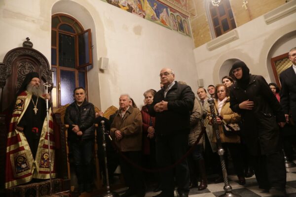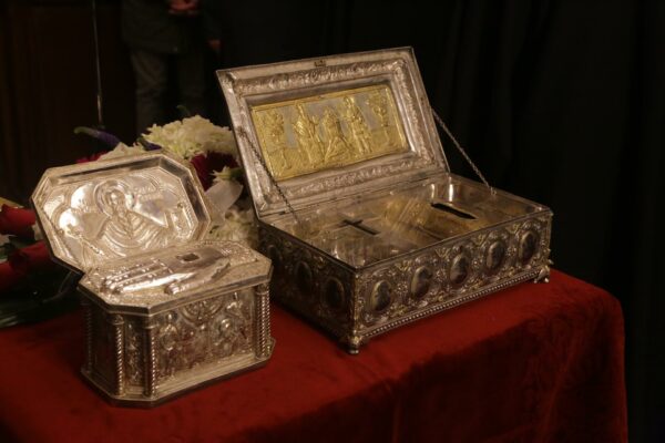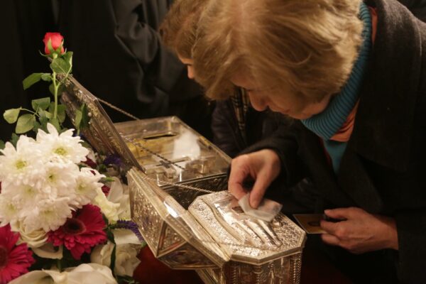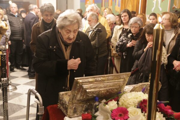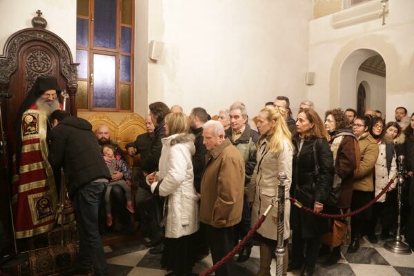 Πλήθος πιστών, όλων των ηλικιών, συμμετείχε με κατάνυξη και ήρθε ευλαβικά στο Μετόχι για να προσκυνήσει το Άγιο Λείψανο της Αγίας Μαρίας της Μαγδαληνής. Δεξιά, έψαλλαν ο κ. Ιωάννης Λιάκος και η συνοδεία του.